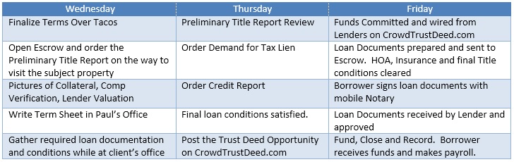 Paul called on a Wednesday and asked if he could get a loan by Friday of the same week. The borrower could not quickly get a conventional loan or acquire a loan against the under construction houses as contractor lien releases would be required. While discussing the loan scenario over lunch, Paul mentioned that he owned a free and clear office condominium nearby. The borrower now had provided the required collateral for a hard money loan. We agreed to the loan terms over Tacos and cleared the decks for a loan to make Paul’s payroll commitment. Here is the timeline for a 48 hour loan: